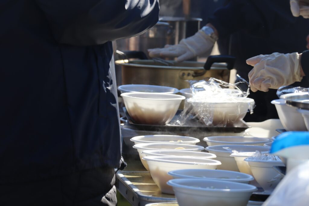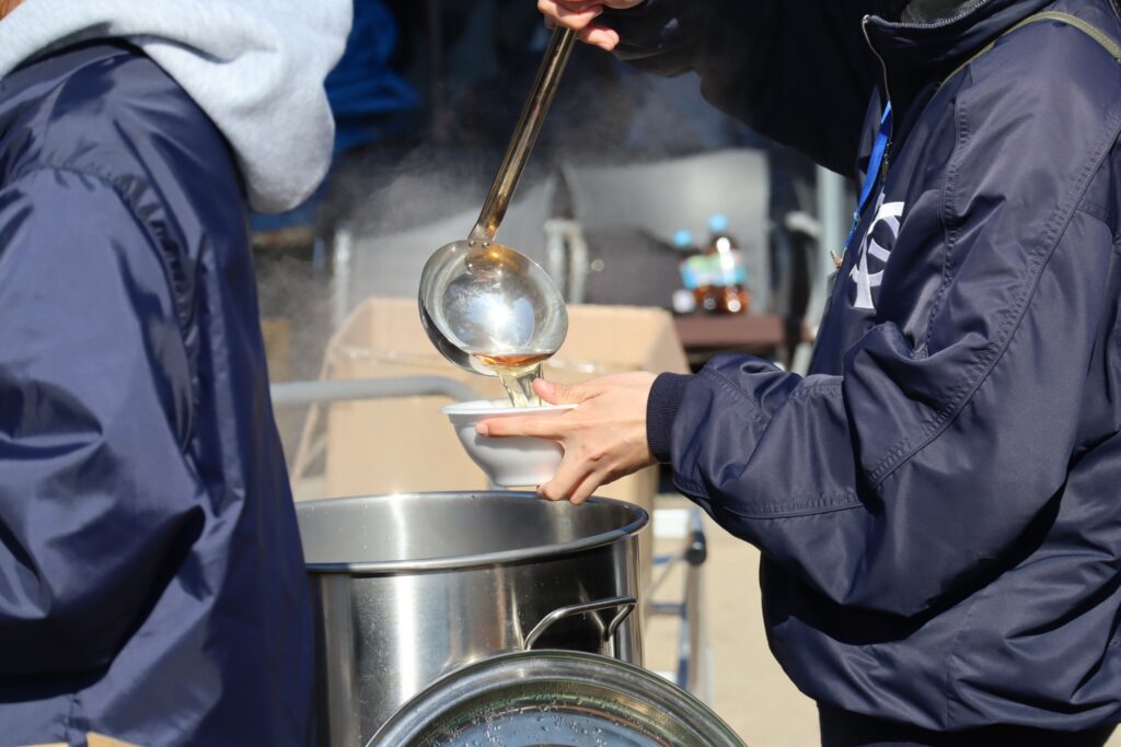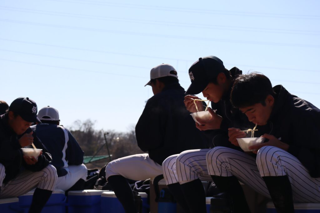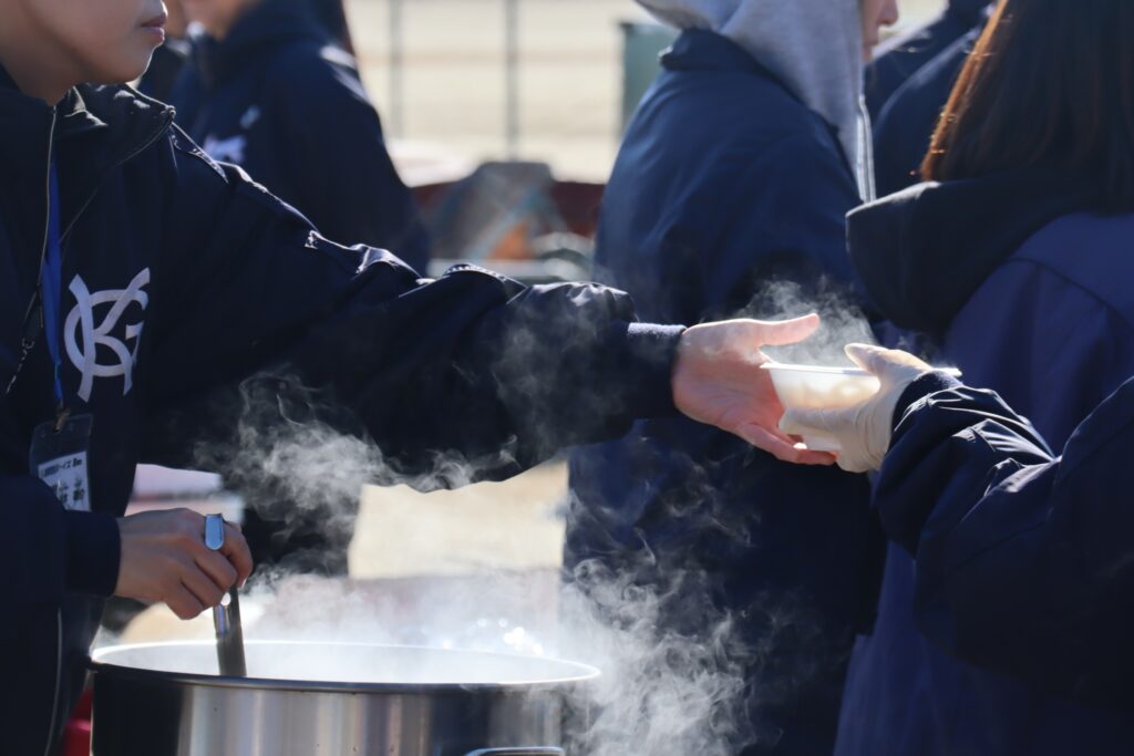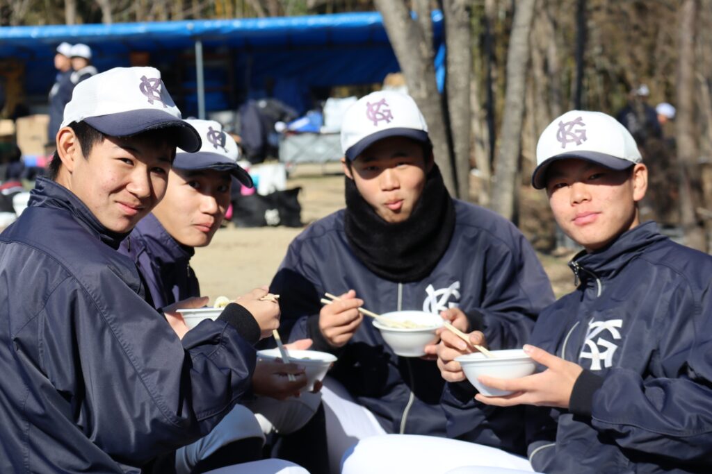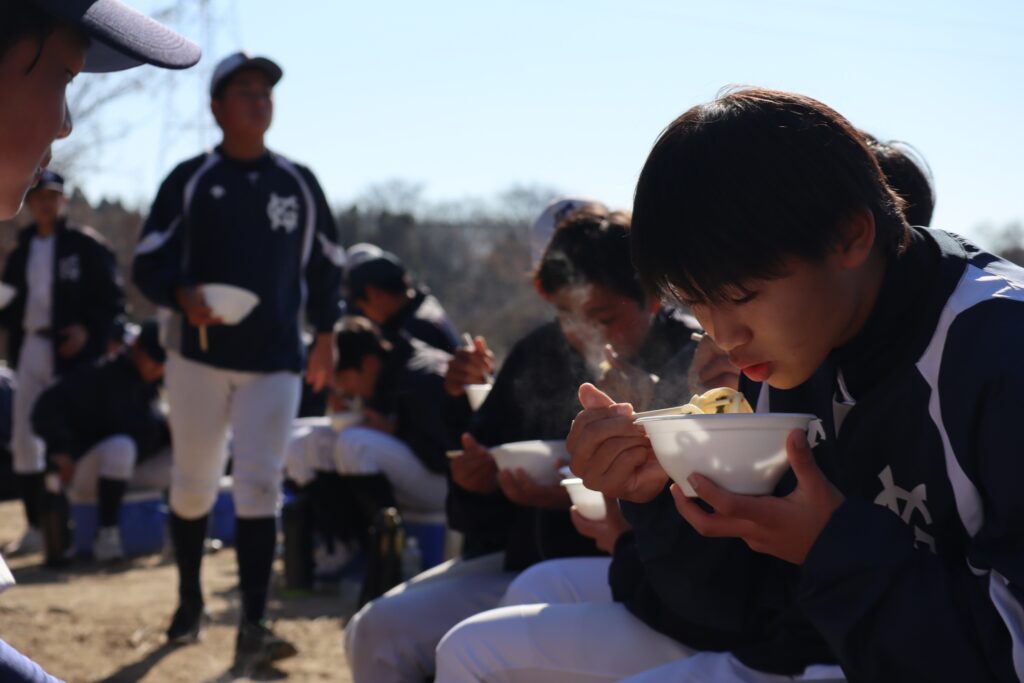 お昼には保護者らによる炊き出しで昼食をいただきました。まだまだ寒さが厳しい中での暖かいおうどん、お餅は格別です。目一杯、身体を鍛えて、しっかり食べる。春先の大会に向けた素晴らしいスタートとなりました。